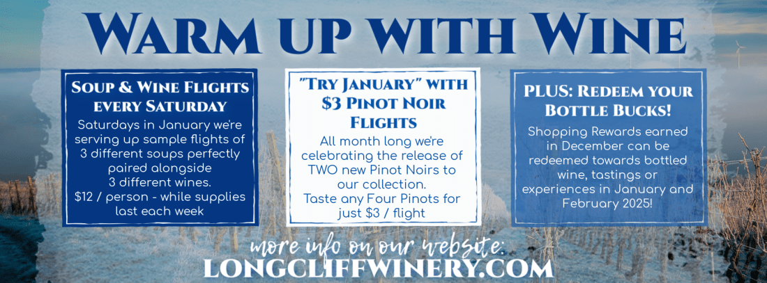 With a total of seven pinots now gracing our tasting menu, we’re offering discounted Pinot Noir tasting flights in January! For just $3, enjoy your choice of FOUR Pinot Noirs!